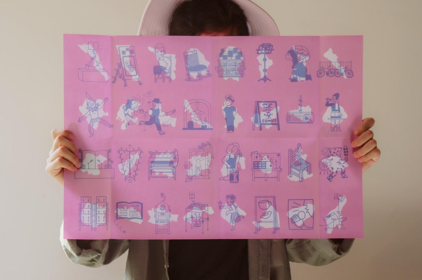 A projekt most lépett új szintre: a digitális térképből fizikai könyv lett. A tervezők komoly korlátokkal néztek szembe – szűkös büdzsé, minimális erőforrások. Mit csináltak? Lehetőséget láttak benne. A borítót kartonból készítették, védőborító nélkül. A legnagyobb kihívás: csak két festékkel nyomtathattak. Élénk rózsaszínt és kéket választottak, amelyek keverésből egy harmadik színt, lilát hoznak létre.